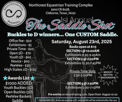 Posted on June 30, 2025August 25, 2025 by tamet1st Annual The Saddle Shot Aug 23 Northcrest Arena $3000 Added – $2750 to Open and $250 to Youth 3D