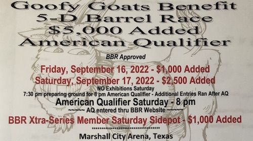 Posted on July 22, 2022September 19, 2022Goofy Goats Benefit $5000 Added + BBR Xtra Series & American Qualifier