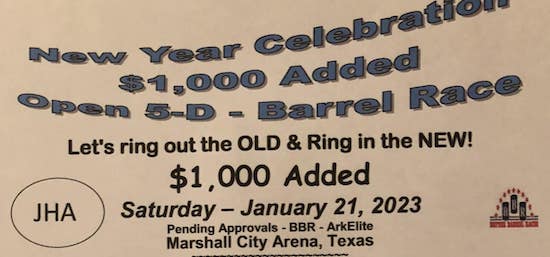 Posted on December 5, 2022February 13, 20232 Heartsbarrelracing New Year Celebration $1000 Added ONLINE ENTRIES CLOSE TUE MORNING JAN 17th at 9am