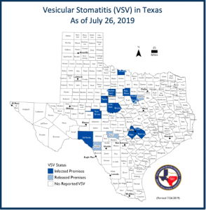 AUSTIN – Since the last vesicular stomatitis virus (VSV) update on Friday, July 19, 2019, the Texas Animal Health Commission (TAHC) has received reports of 11 new confirmed cases of vesicular stomatitis virus (VSV).