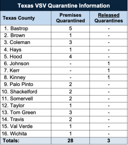 To date, 31 premises in 16 Texas counties have been confirmed with VSV. Of the 31 premises, 3 have been released. Currently affected counties include: Bastrop, Brown, Coleman, Hays, Hood, Palo Pinto, Shackelford, Somervell, Taylor, Tom Green, Travis, Val Verde, and Wichita counties.