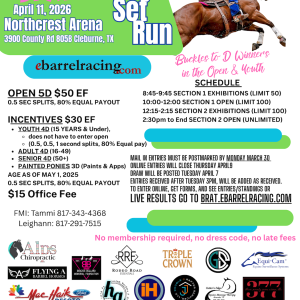 BRAT – Ready Set Run Buckles to D winner in Open and Youth 11 Apr Enter Online 8:45 am - 10:00 pm Northcrest Equestrian Center 3900 CR 805 B Cleburne , TX 76301