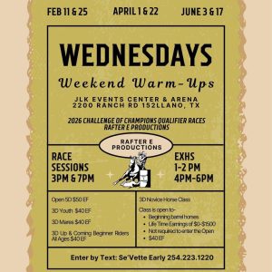 Weekend Warm-ups Wednesdays 01 Apr 1:00 pm - 9:00 pm (JLK) John L Kuykendall Event Center & Arena 2200 Ranch Road 152, Llano, TX