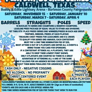 Second Chance Cowgirl Productions Spring Playday Buckle Series 04 Apr 9:45 am - 9:00 pm Buddy & Edile Lightsey Arena 298 Rodeo Dr, Caldwell, TX 77836
