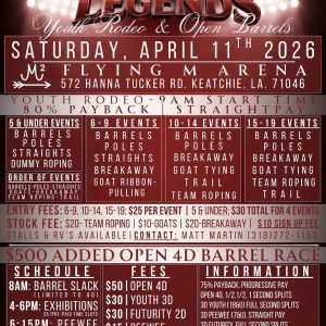 Little Legends Youth Rodeo & Open Barrels 11 Apr 9:00 am - 10:00 pm Flying M Arena 572 Hanna Tucker Rd, Keachi, LA 71046