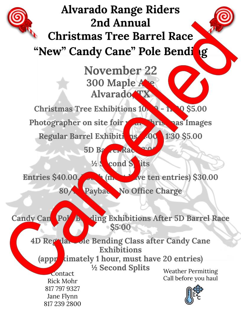 Home Events - Ebarrelracing.com Barrel Race Poles Alvarado Range Riders 2nd Annual Christmas Tree Race – Canceled Alvarado Range Riders 2nd Annual Christmas Tree Race – Canceled The event is finished. Date Nov 22 2025 Expired! Time 10:00 am - 10:00 pm Local Time Timezone: America/New_York Date: Nov 22 2025 Time: 11:00 am - 11:00 pm Labels Canceled Location Alvarado Range Riders Arena 300 Maple Street, Alvarado, Texas 76009 Website https://bestarenas.com/texas/alvarado-range-riders-arena-photo-tour/ Category Barrel RacePoles Share this event Weather Light rain 59 °F Wind: 13 MPH Humidity: 100 % Feels like: 59 °F X