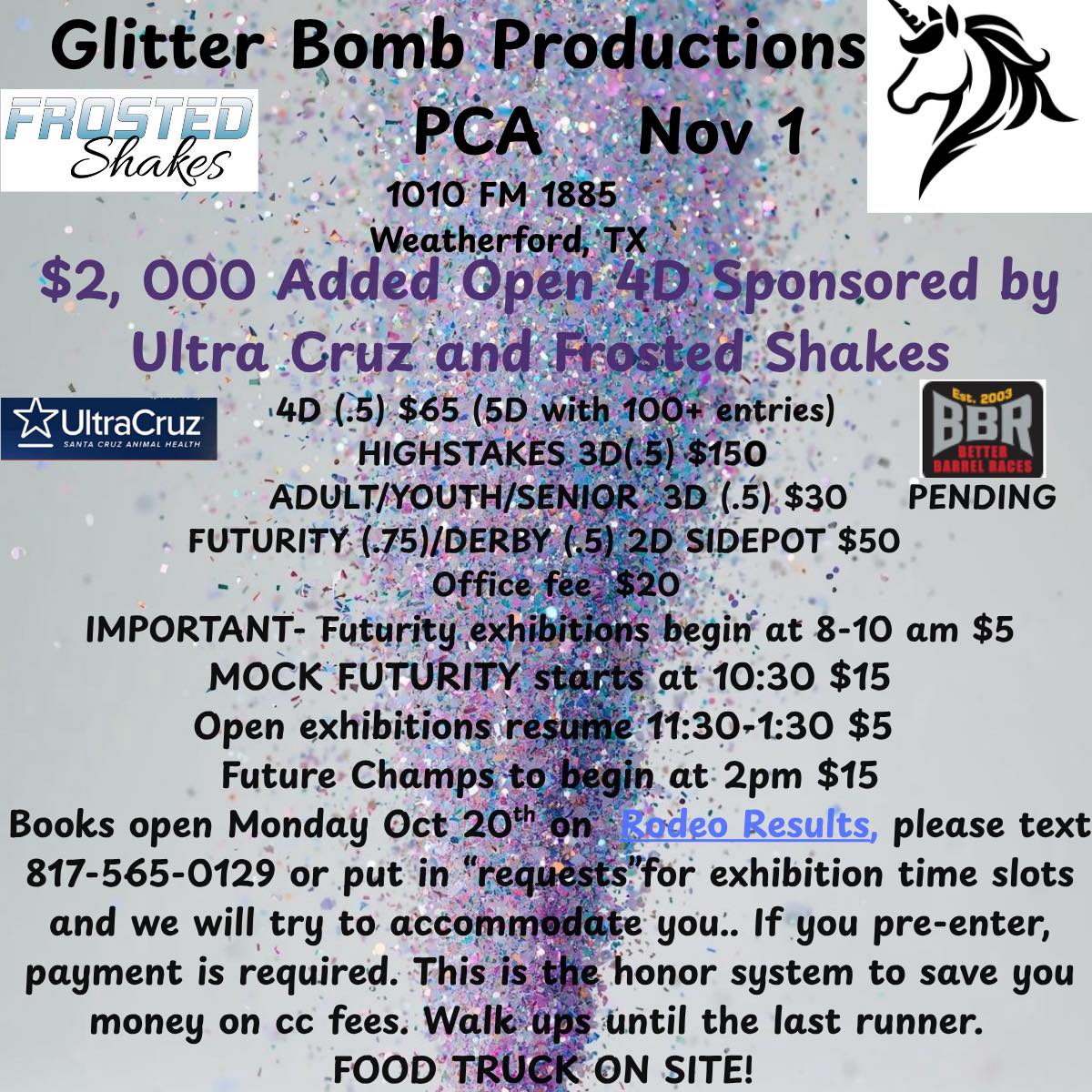 Books open Monday Oct 20th on rodeo results please text 817-565-0129 or put in ‘requests’ what time you would like your exhibitions and I will do the best to accommodate. If you pre enter, payment is required. This is the honor system to save you money on cc fees.