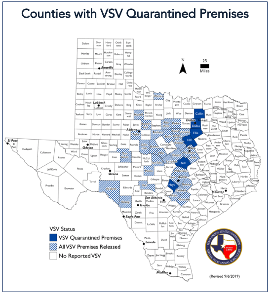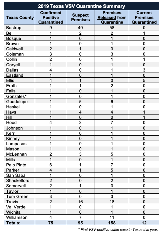 To date, 170 premises in 37 Texas counties have been quarantined for VSV. Currently affected counties include: Bell, Collin, Dallas, Ellis, Hays, and Hill counties. Of the 170 premises quarantined, 158 have been released.