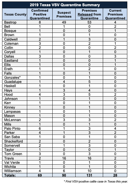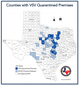 To date, 154 premises in 34 Texas counties have been quarantined for VSV. Currently affected counties include: Bastrop, Bell, Bosque, Collin, Dallas, Eastland, Ellis, Hood, McLennan, Palo Pinto, Parker, Taylor, and Travis counties. Of the 159 premises quarantined, 131 have been released.