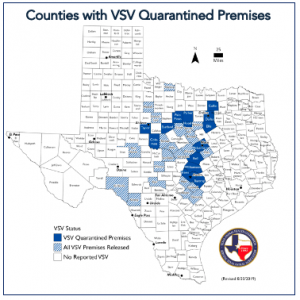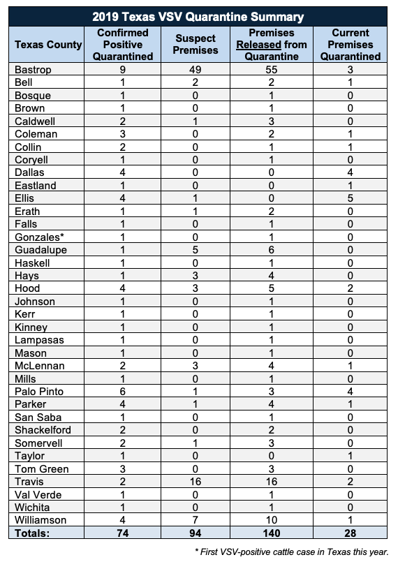 To date, 168 premises in 36 Texas counties have been quarantined for VSV. Currently affected counties include: Bastrop, Bell, Coleman, Collin, Dallas, Eastland, Ellis, Hood, McLennan, Palo Pinto, Parker, Taylor, Travis and Williamson counties. Of the 168 premises quarantined, 140 have been released.