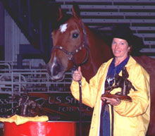 - They are all my favorites.--Probably the one I was closest to was an orphan I raised. He would get up on the front porch and nurse my son and daughter's fingers through the front window. His nickname was "Little Bit," because he was a little bit of trouble being an orphan. His reg.name was Win or Trouble, and he won the Woodward PRCA rodeo and qualified me for the Prairie Circuit Finals. I gave him to my daughter, DeLena, to run and she won the Freedom, OK Jr. barrel race on him two years in a row. He gave us a lot of good memories.